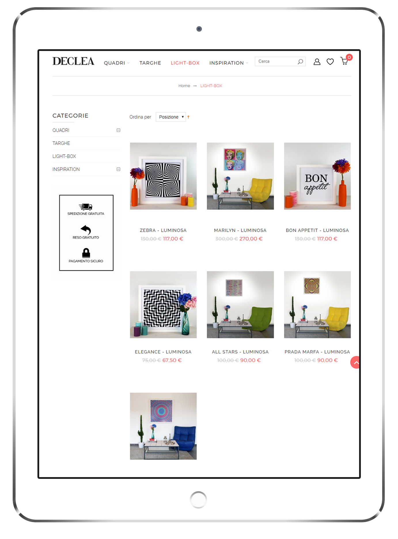 Per questo progetto, il team di sviluppatori della 3d0 ha lavorato ad una minuziosa personalizzazione del template magento selezionato dal committente Declea, per venire incontro alle sue specifiche esigenze commerciali e per restituire all’utente/cliente un’esperienza di navigazione comoda e piacevole.