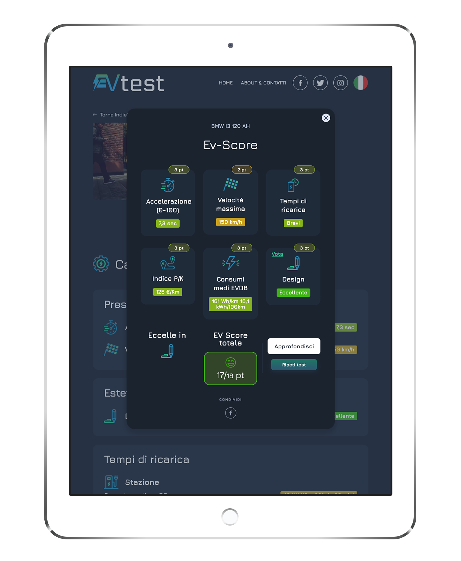 Il portale evtest.eu si pone l'obiettivo di far conoscere al grande pubblico il potenziale tecnologico e di prestazioni che garantiscono oggi i veicoli elettrici (EV). I dati raccolti sono rigorosamente ufficiali e reperibili su EV-database.org. Dalla somma dei parametri selezionati ogni veicolo raggiunge un preciso EVscore di riferimento.