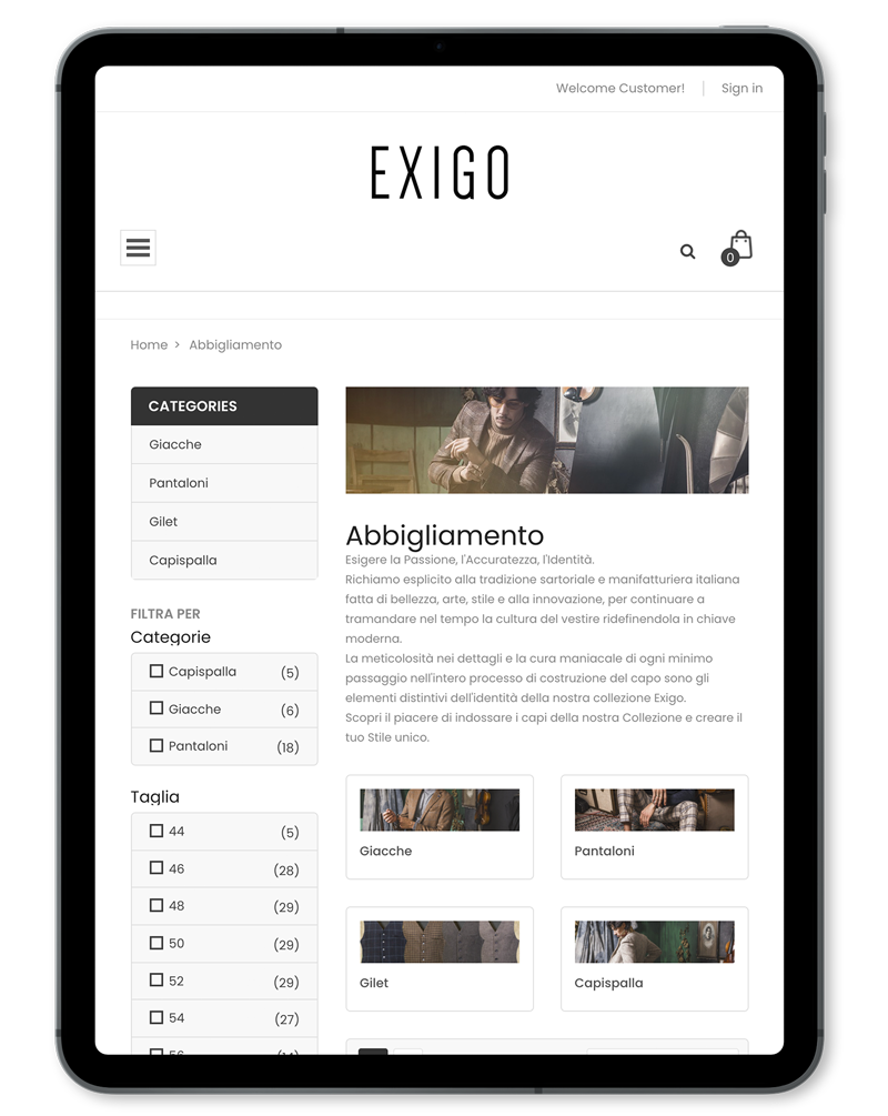 L’attività del brand Exigo si riassume in tre aspetti fondamentali: la ricerca costante di trasferire l’aspetto creativo dell’arte nell’abbigliamento; un’esperienza pluridecennale grazie alla quale poter soddisfare le esigenze del consumatore moderno; la voglia di trasmettere ai proprio clienti un’emozione quando acquistano un articolo.