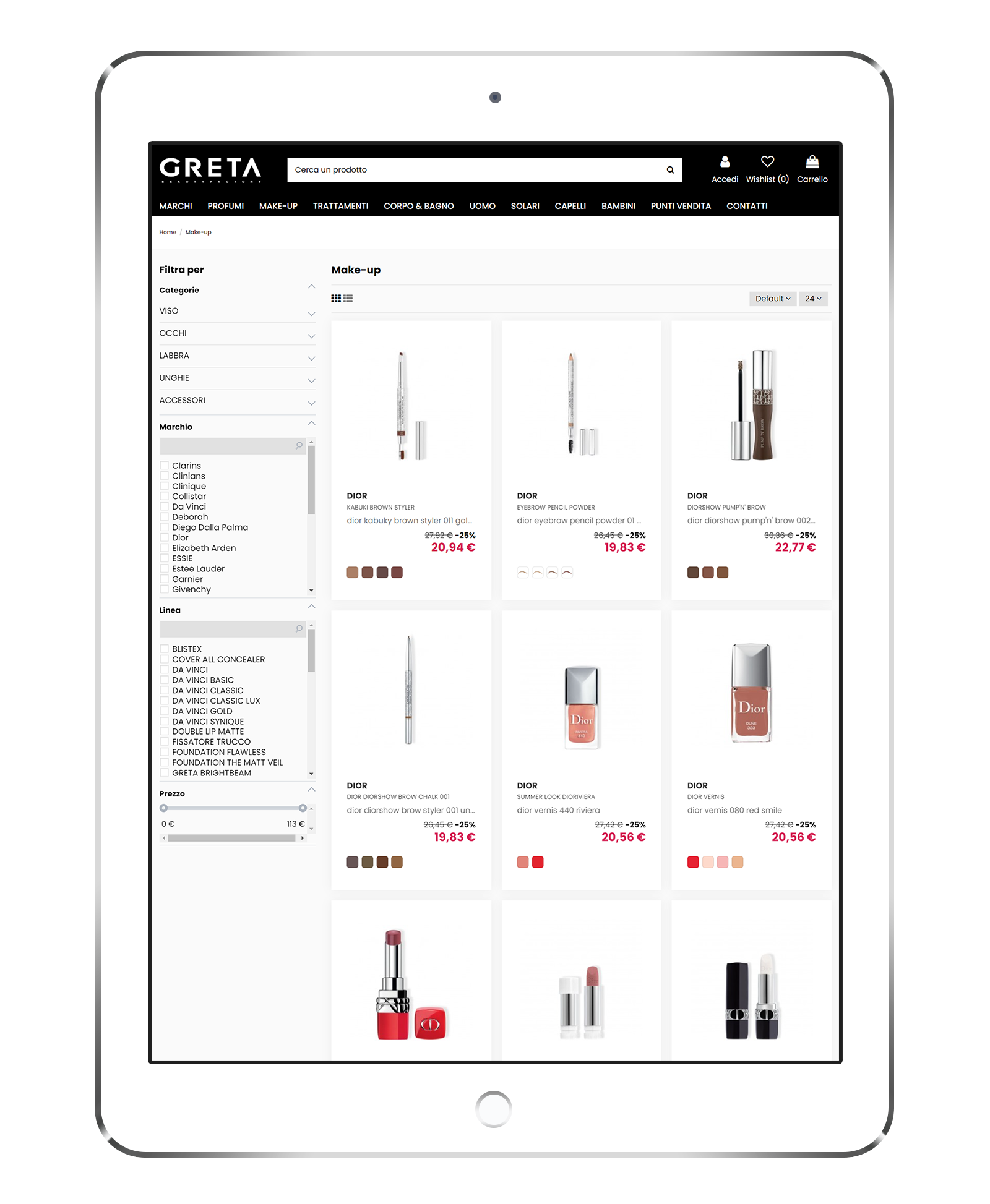 greta.shop è un portale dedicato alla bellezza, che vanta i migliori prodotti del settore, frutto della ricerca costante dei più noti e apprezzati marchi della cosmetica internazionale. Un assortimento unico per varietà e qualità, dai trattamenti anti-aging al make-up, dall’igiene personale ai profumi, dai solari all’epilazione, ogni singolo prodotto è attentamente selezionato per offrire il massimo della qualità e del risultato.