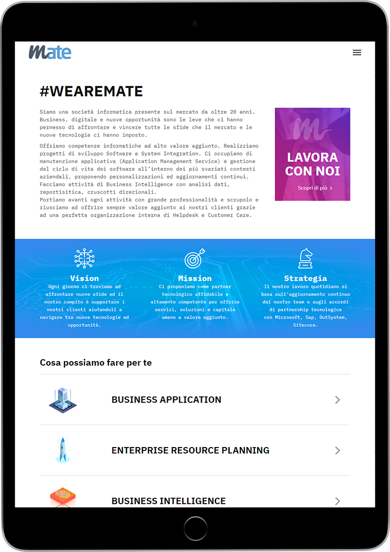 Il nuovo layout per il sito web mateconsulting.it nasce da una partnership radicata fra la 3d0 e Mate, già sperimentata con successo su progetti di respiro internazionale e riaffermata in questo caso per il restyling del sito istituzionale, che si presenta adesso in una veste più moderna, dal sicuro impatto iconico e cromatico, e con un’attenzione particolare al recruitment.