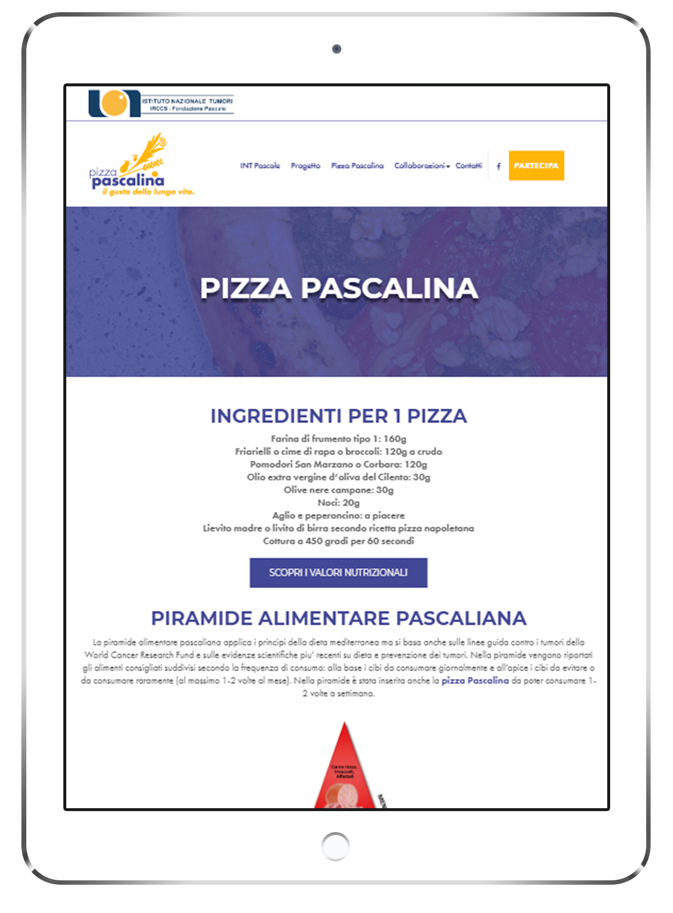 La Pizza Pascalina è un progetto dell’Istituto Nazionale dei Tumori Fondazione Pascale di Napoli che mira alla diffusione di un comportamento sano e attento ad una corretta alimentazione e contribuisce alla lotta contro il cancro.