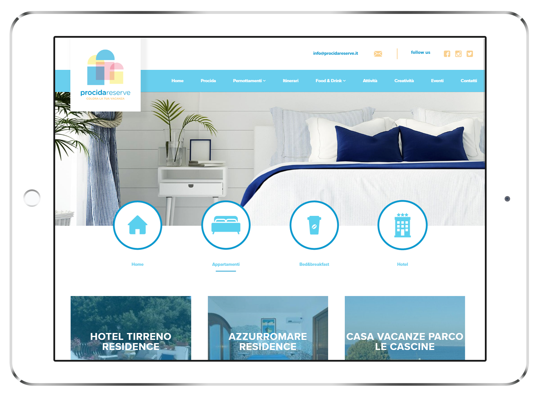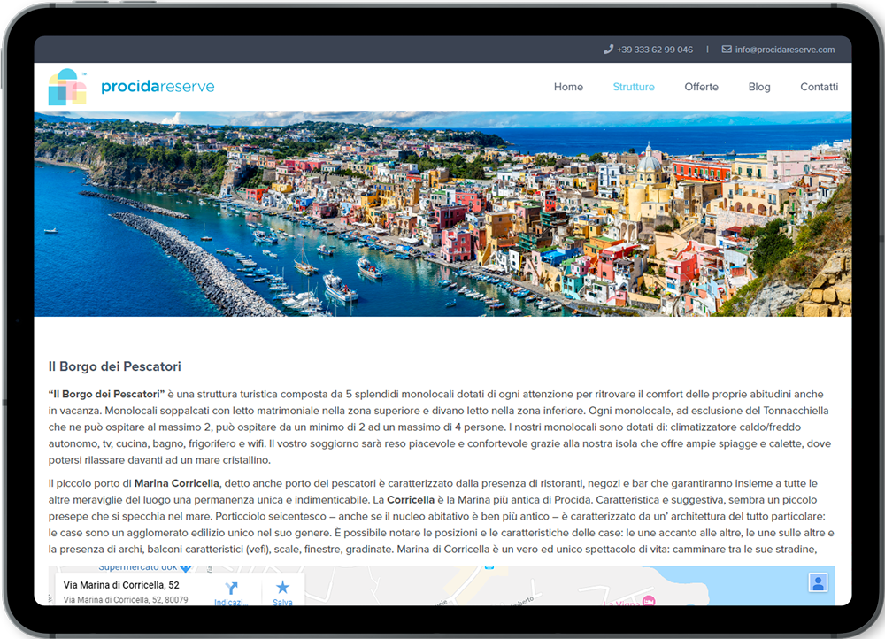 procidareserve.com e discoverprocida.com sono due portali, il primo di booking turistico ed il secondo informativo-esplorativo, realizzati in collaborazione con la Inconcept Communication, che si è occupata della ideazione grafica del layout dei siti, mentre 3d0 ha seguito il progetto in tutte le fasi di programmazione e sviluppo front-end e back-end.