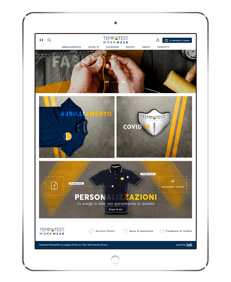 Il brand che cura la produzione della linea di abiti ed accessori da lavoro legata al marchio TEMPOTEST decide di rinnovare la sua web identity e si affida ancora una volta con fiducia al team grafico della 3d0, che ne rinnova completamente il visual puntando su un layout più moderno che accompagna l'utente in una navigazione chiara ed immediata tra le pagine del catalogo di questo e-commerce, sviluppato inoltre attraverso una piattaforma CMS ancora più innovativa e performante.